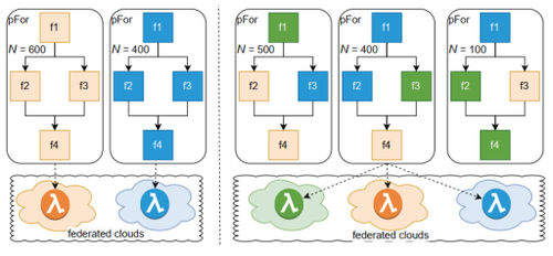 除了数据的分布会促使 Serverless 必须接受 Regionless,[6]的作者还观察到:一个云厂商的每个 Region、每个厂商都有不同的并发度限制,并且之间的数据传输时延、存储的数据、每种任务执行的速度等能力均不一致。简单的将应用分发到多云/多 Region 上并不一定能充分提升并发度和整体完成时间。例如图2左侧所示(每种颜色标记的云上并发度限制为 1000,整体应用由 f1-f4 任务构成,也需要运行 1000 次),如果f1在蓝色标识的云资源上运行地快,而 f4 则在橙色上快时,均匀分布则不能利用这个性能差异,而且在橙色云上,f2 和 f3 并不能充分并行(完全并行需要 1200 并发度),进一步影响整体执行时间。在此情况下,如何合理选择任务所使用的云资源(如图2右侧所示),以有效地提升并发度是[6]所研究的重点。为此,中提出了基于三层数学抽象构建的调度器算法 FaaSt。FaaSt 能够合理地将各个任务调度和合适的云厂商 Region上,使得整体的任务完成时间最短。经过在 AWS 和 IBM 云上 4 个 Region 的实验对比,FaaSt 调度后的任务完成时间比单云提升 2.82 倍。
