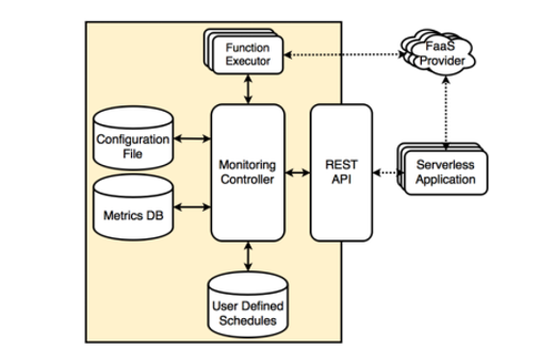 为了协助用户选择合适的平台以执行 Serverless 任务,中提出了 MPSC 框架,其核心思想是通过实时监控 Serverless 任务在不同平台上执行的性能,进而选择最具性价比的平台。MPSC 的架构如图3所示,其中 Monitoring Controller 为核心组件,用于协调监控指标采集分析和任务调度。Function Executor 则负责将任务分发至各个平台执行,并采集对应指标。除此之外,还有三个存储模块分别用于储存用户配置、监控指标、用户定义的调度逻辑。