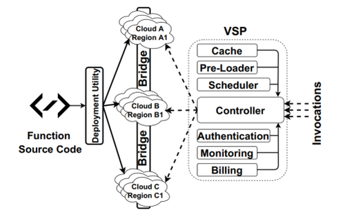 在 Serverless 任务能够合理分发的基础之上,来自 CMU 和 UBC 的学者提出了虚拟 Serverless 提供商( virtual Serverless provider, VSP )的概念。VSP 作为第三方的平台,聚合了各个厂商的 Offerings,为用户提供统一的使用接口,为用户动态选择最具性价比的 Offering。VSP 整体架构如图4 所示,其中核心组件包括:Scheduler 用以根据性能指标和花费计算最合适的云平台;Controller 则负责将应用请求映射到 Scheduler 选择的云平台上;Bridge 用于不同云平台之间任务的交互;Monitor 用以记录调度到不同平台上任务的执行性能;Pre-Load 用于初始化新接入的云平台;而 Cache 则记录了平台执行情况用于后续分析优化。通过在 AWS 和 Google 云平台上的测试,VSP 将 Serverless 任务的吞吐量提升了 1.2-4.2 倍,同时降低了 54% 的云资源使用成本。