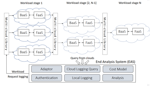1)统一的 API 和 SDK ,用于让用户不需要感知底层差异即可将不同人物部署在不同的云平台上,并且为了降低用户的学习门槛,还提供了基于某一家云平台提供商的 API 和 SDK(如 AWS)拓展出来的、可以将任务部署在其他云平台的 API 和 SDK;2)分析系统( EAS ),用于分析每个任务最适合的云平台,包含用于将任务分发至不同平台的 adaptor、各个平台log的收集器 Cloud Logging Query、各个云厂商的计费模型 Cost Model、接入各个云平台的鉴权组件 Authentication、任务执行的记录 Local Logging 以及性能分析器 Analysis。