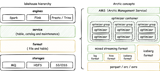 arctic是一个开放式架构下的湖仓管理系统,首先它面向开放式架构,面向不同的 table format。现在,主要面向 Iceberg format,然后企业自己也在Iceberg之上有一套Mixed streaming format的实现。以后也会去尝试去对接更多的 table format,比如说 Hudi 或者Delta,我们认为他们有管理优化等相同的需求,arctic 都是可以作为一套湖仓管理系统去对接这些format。arctic是在开放的表格式之上,首先它与Iceberg 、Hudi不是竞争关系,arctic是这些技术之上的管理服务。Arctic面向场景更多地关注流和实时更新的场景,并且提供一套可插拔的数据自优化的管理服务。