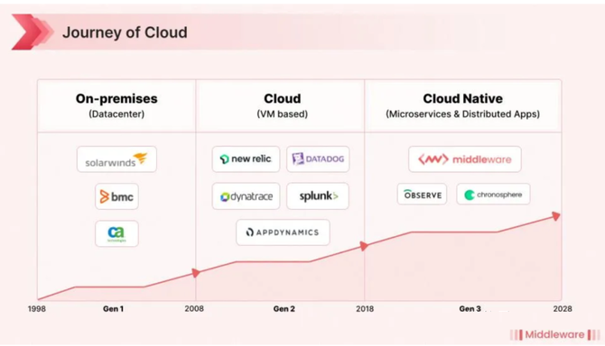 在本地云时代,催生了 Solarwinds、BMC 和 CA Technology 等几家公司。随着云时代的到来(即 AWS 出现),市场的格局发生了变化,出现了 Datadog、New Relic、Sumologic、Dynatrace、Appdynamic 等新公司。