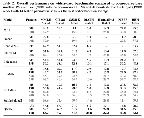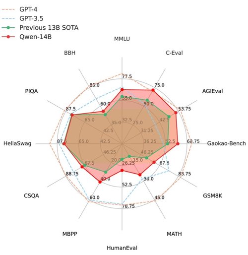 图1:Qwen-14B在十二个权威测评中全方位超越同规模SOTA大模型