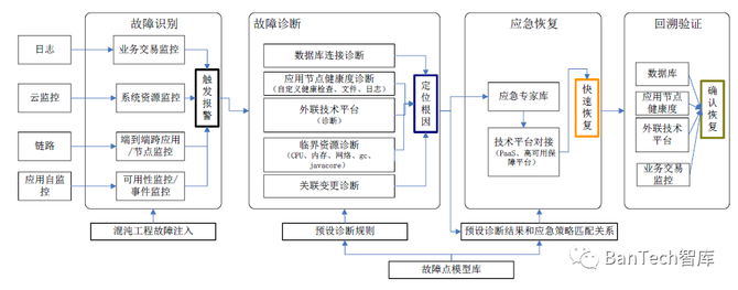 结合工商银行业务系统“1-5-10”故障处理目标,将故障管理划分为故障识别、故障诊断、故障恢复、回溯验证四个阶段。依托智能运维架构,提升业务实时画像系统整体能力,着重在监控全面性、故障诊断及自动化应急方面开展建设。目前计划通过专家库匹配模式解决大部分简单故障场景问题,部分复杂故障问题通过自动化及智能化分析手段定位根因及应急,如图3所示。