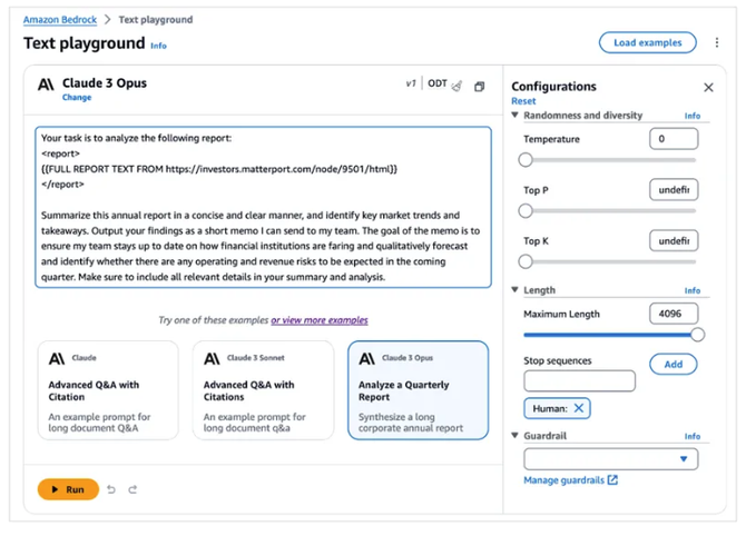 2024年4月17日,亚马逊云科技宣布,在Amazon Bedrock上正式推出来自Anthropic的Claude 3 Opus模型,该模型是Claude 3家族中最智能的模型,在高度复杂的任务上表现卓越,并拥有惊人的流畅性和类似人类的理解能力,能够高效应对开放性提示和未知的全新场景。至此,Amazon Bedrock也成为了首个提供所有Claude 3系列模型的全托管服务,其中包括Claude 3 Opus和此前推出的Claude 3 Sonnet与Claude 3 Haiku。