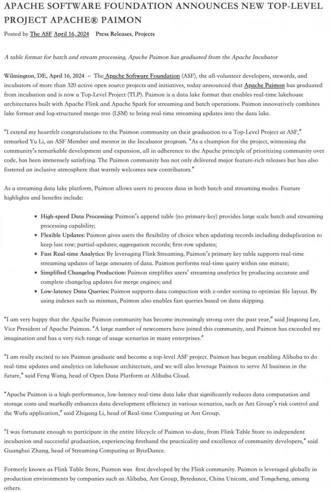 祝贺 Paimon 毕业并成为 ASF 的优秀项目。事实上,Paimon 已经开始帮助阿里巴巴对 Lakehouse 架构进行实时更新和分析,此外,我们还将在未来利用 Paimon 为 AI 业务服务。