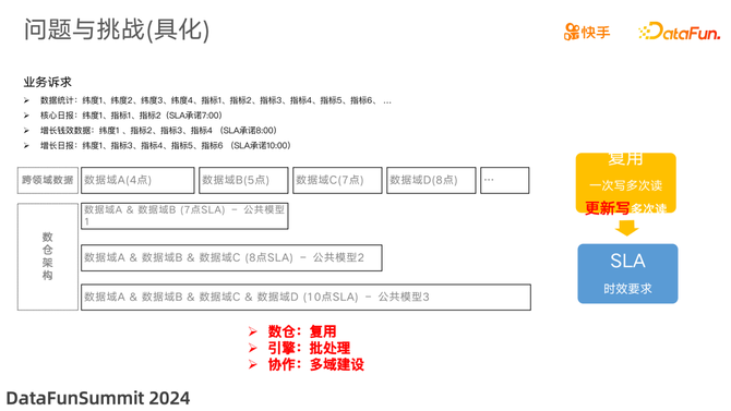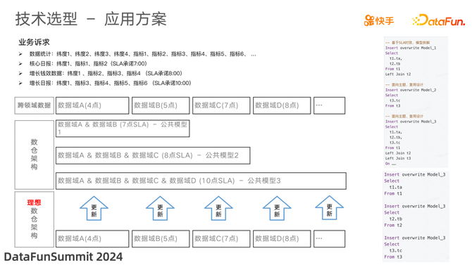 选定引擎后,对数仓架构的规划蓝图是:按照业务实体整体设计大宽表,实现跨领域的打通(增长、商业化、电商),跨业务的并行协作;单领域(增长)的多业务过程的团队内并行协作;业务间&团队内实施的同学关注于实体粒度下实现。依据 SLA 的诉求将模型拆成合理的子任务,通过更新的方式补充模型数据内容。