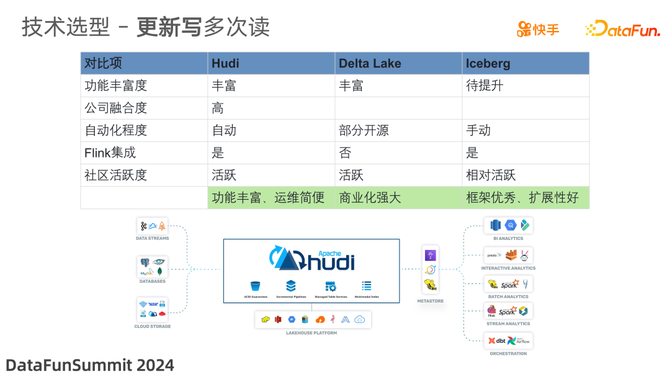 综合对比后,Hudi 凭借其丰富的功能、与现有架构的良好适配性,以及相对较低的运维成本,成为快手大数据团队的首选。