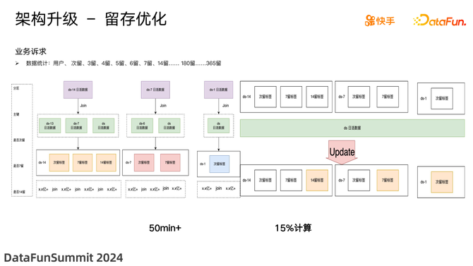 基于引擎的更新能力,对数仓模型的设计思路和实现方式也有根本上的改变;比如,在计算 N 留存的设计,从过完多次重复的笛卡尔积计算转为简单更新计算,在时效和成本上取得显著收益。