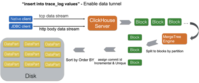 ClickHouse通过LSM实现数据的预排序,从而减少磁盘的读取量。原理就是将乱序数据通过LSM在内存中排序,然后写入磁盘保存,并定期合并有重合的磁盘文件。ClickHouse的写入步骤可以总结为以下几点: