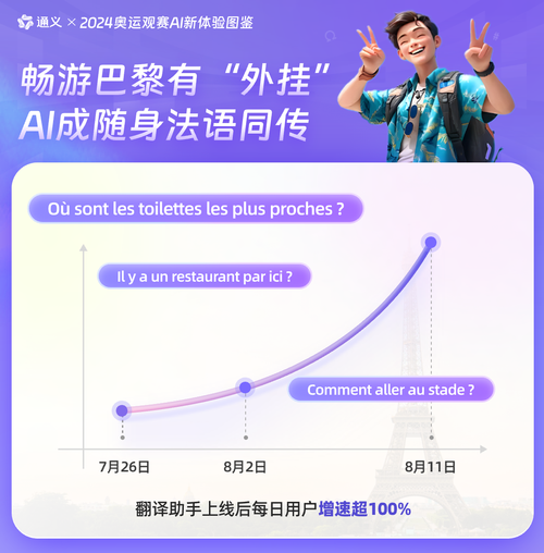 对于去到巴黎现场的体育迷们来说,法语再也不是难题。通义App在奥运期间上线的“翻译助手”,可实现中法互译,上线后每日用户增速超100%。