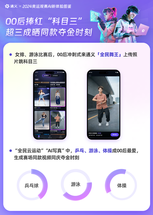 赛场的每一次夺金时刻,都会引发用户“冲刺式”晒出同款赛场视频。中国女排获胜后现场响起“科目三”,用户冲进通义App跳同款热舞为女排加油。在全民云运动中,一位用户最多创作了64条创意视频;在AI写真中,乒乓、游泳、体操等运动同款最受欢迎。