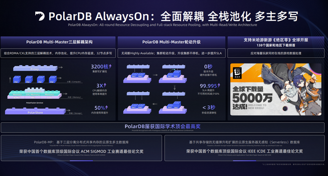此外,云原生数据库PolarDB今年首次提出基于“三层解耦, 三层池化”(存储、内存、计算)、AlwaysOn架构的多主多写和秒级Serverless能力,解决了多主架构中冲突处理和数据融合、以及Serverless秒级弹性租户隔离的难题。在高并发场景下,PolarDB性能为业界同类数据库3倍,并凭以上成果成功摘得中国首个ACM SIGMOD和IEEE ICDE工业赛道“最 佳论文奖”。