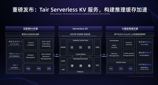 本次云栖大会,阿里云瑶池还正式发布了云原生内存数据库Tair Serverless KV服务,是阿里云首个基于NVIDIA TensorRT-LLM的推理缓存加速云数据库产品。Tair采用NVIDIA TensorRT-LLM一起进行了深度优化。相比开源方案,该服务可实现PD分离/调度优化吞吐30%的提升 ,预计成本可降低 20%。