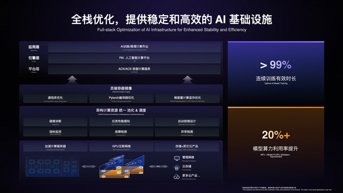 9月20日,2024云栖大会现场,阿里云全面展示了全新升级后的AIInfra系列产品及能力。通过全栈优化,阿里云打造出一套稳定和高效的AI基础设施,连续训练有效时长大于99%,模型算力利用率提升20%以上。