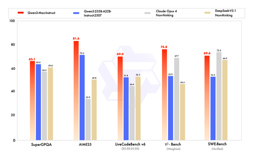 Qwen3-Max为通义千问家族中最大、最强的基础模型。该模型预训练数据量达36T tokens,总参数超过万亿,拥有极强的Coding编程能力和Agent工具调用能力。在大模型用Coding解决真实世界问题的SWE-Bench Verified测试中,Instruct版本斩获69.6分,位列全 球 第一梯队;在聚焦Agent工具调用能力的Tau2-Bench测试中,Qwen3-Max取得突破性的74.8分,超过Claude Opus4和DeepSeek-V3.1。