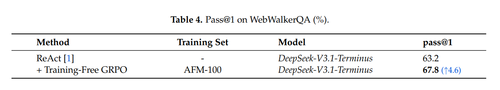另外,在网页搜索场景中,Training-Free GRPO也能显著提升实力。开发者无需更新模型参数,即可在DeepSeek-V3.1-Terminus强悍水平之上,实现4.6%的显著提升。