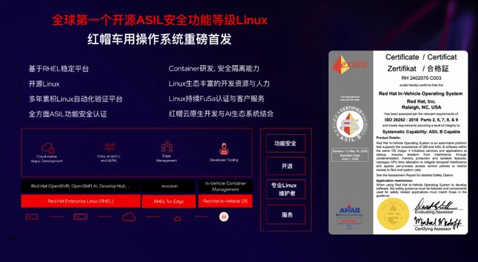 基于开源生态“开枝散叶”,除了在硬件层面的联合创新,红帽还推出了一个重磅彩蛋,那就车用操作系统。红帽的车用OS不只可以操控汽车本身,还可以兼顾到企业内部IT。此前,红帽一直在做车用AI和边缘AI场景,其中AI操作系统的核心就是vLLM,现在vLLM逐渐过渡到可以支持更多模型,这意味着用户可以用一套架构支持车用过程中的其他模型,而不再采用很多企业名誉上称为是“自研OS”,但实际上采用的是红帽底层的操作系统加上上层的中间件和其他应用。红帽希望通过开源生态体系,让车用操作系统创新更透明、稳固、安全和可靠。正是这种开放、合作的企业理念,让红帽获得了大量客户的认可。比如:在汽车领域,宝马、通用等知名企业,都是红帽的客户。