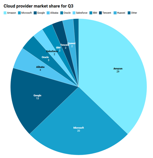 亚马逊以29%的份额保持领先,微软以20%紧随其后,谷歌凭借13%位居第三。这三家巨头合计占据了63%的市场份额,形成了稳固的第一梯队。