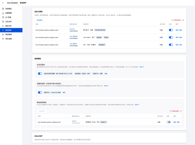 正式版 EdgeOne Pages 支持用户自定义安全防护策略,包括速率限制、IP黑/白名单、Referer 黑名单、UA 黑/白名单等