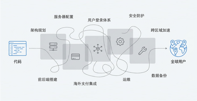 过去,Web 项目出海面临“部署周期长、上线速度慢”的问题。以 AI 工具为例,许多团队选择将产品以 SaaS 模式推向海外市场以寻求增长,然而,海外部署涉及架构规划、服务器采购与配置、前后端搭建、用户登录体系(邮箱验证、第三方登录等)接入、海外支付(多币种与回调处理)集成、运维、备份、跨区域加速等复杂环节,项目上线往往耗费数周。
