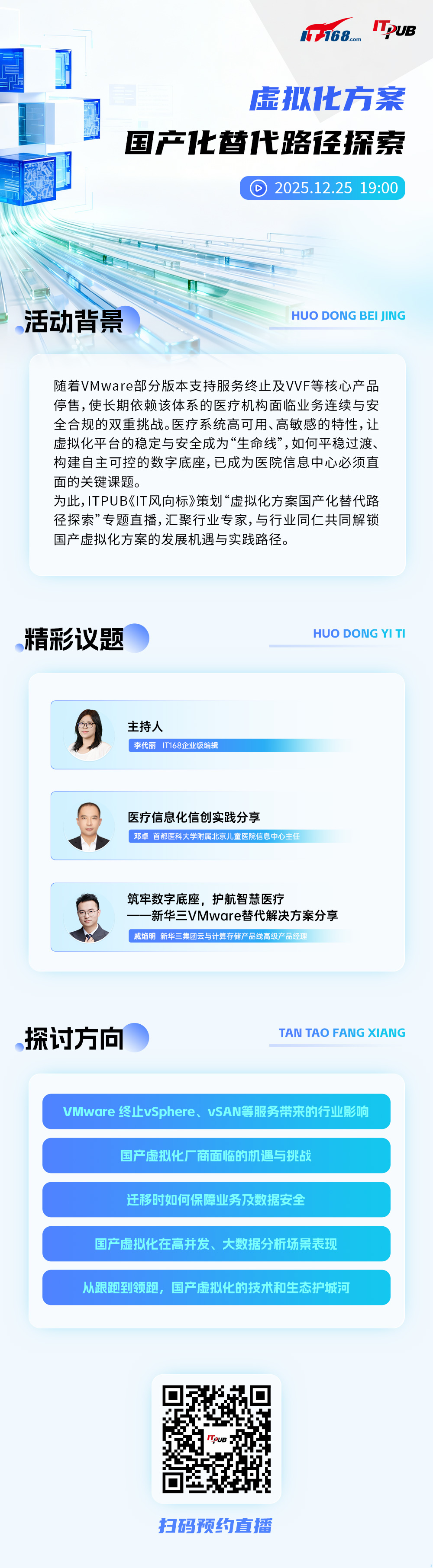 为此,ITPUB《IT风向标》策划“虚拟化方案国产化替代路径探索”专题直播,汇聚行业专家,与行业同仁共同解锁国产虚拟化方案的发展机遇与实践路径。