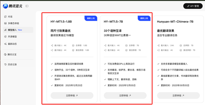 12月30日,腾讯混元宣布推出并开源翻译模型1.5,共包含两个模型:Tencent-HY-MT1.5-1.8B 和 Tencent-HY-MT1.5-7B,两个模型均支持 33 个语种互译以及5种民汉/方言,除了中文、英语、日语等常见语种,也包含捷克语、马拉地语、爱沙尼亚语、冰岛语等小语种。模型已在腾讯混元官网上线,通过开源社区也可以直接下载使用。