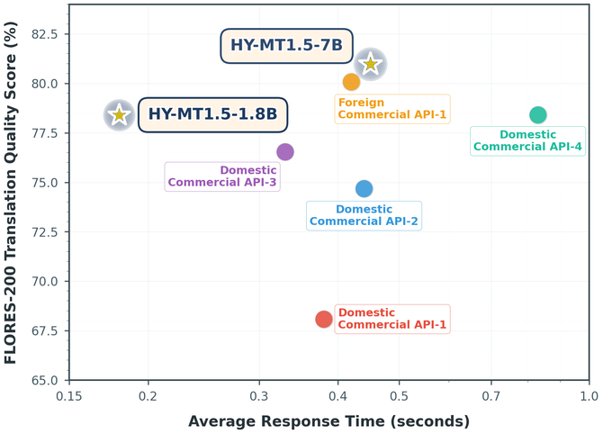 HY-MT1.5系列模型在翻译质量与响应效率之间达到了出色的平衡。具体而言,HY-MT1.5-1.8B模型在FLORES-200质量评估中取得了约78%的分数,同时平均响应时间仅为0.18秒,超越主流商用翻译API,显示出明显的速度优势,凭借优化的模型设计和推理逻辑,其领先的效率使其高度适用于即时通讯、智能客服、移动翻译应用等高吞吐、实时翻译场景。