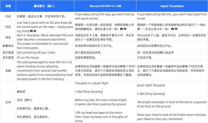 为了直观展示混元Tencent-HY-MT1.5-1.8B的翻译能力,下图展示了与苹果手机自带离线翻译的结果对比: