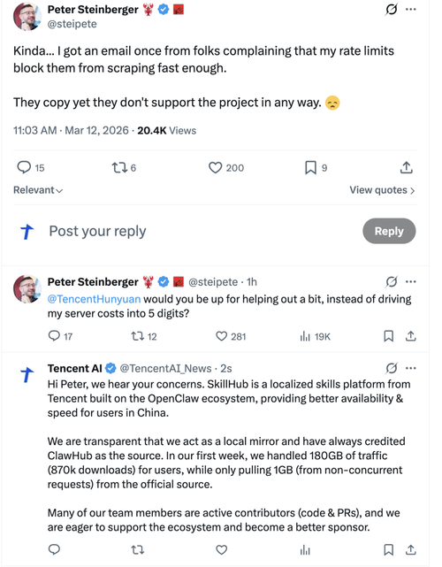 3月12日,OpenClaw创始人Peter Steinberger在社交媒体公开发文“抱怨”腾讯:“只会照搬抄袭,却没有以任何形提供过支持。”他还@腾讯混元团队并喊话:“你们能不能搭把手帮衬一下,而不是把我的服务器成本硬生生推高到五位数?”