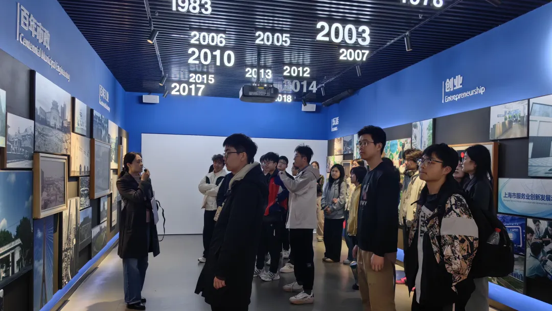 随后,研学队伍走进大创智创新发展示范区。在大创智展厅内,同学们系统了解了杨浦从“工业锈带”向“数字创新高地”转型的历程。这片土地从百年工业遗存起步,如今已成为集聚数千家数字文创、智慧硬件、人工智能企业的创新热土。“校区-园区-社区”三区联动的特色发展模式,给同学们留下了深刻印象。